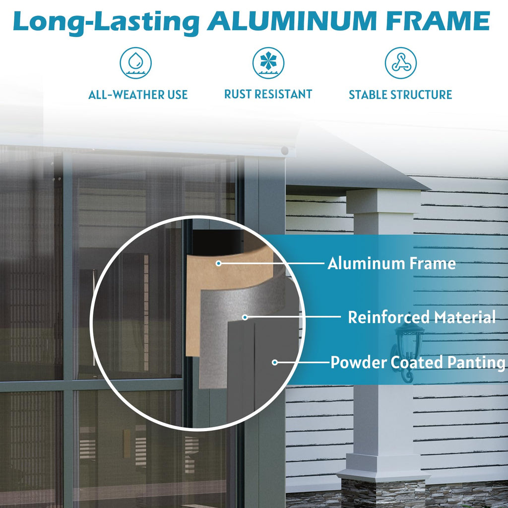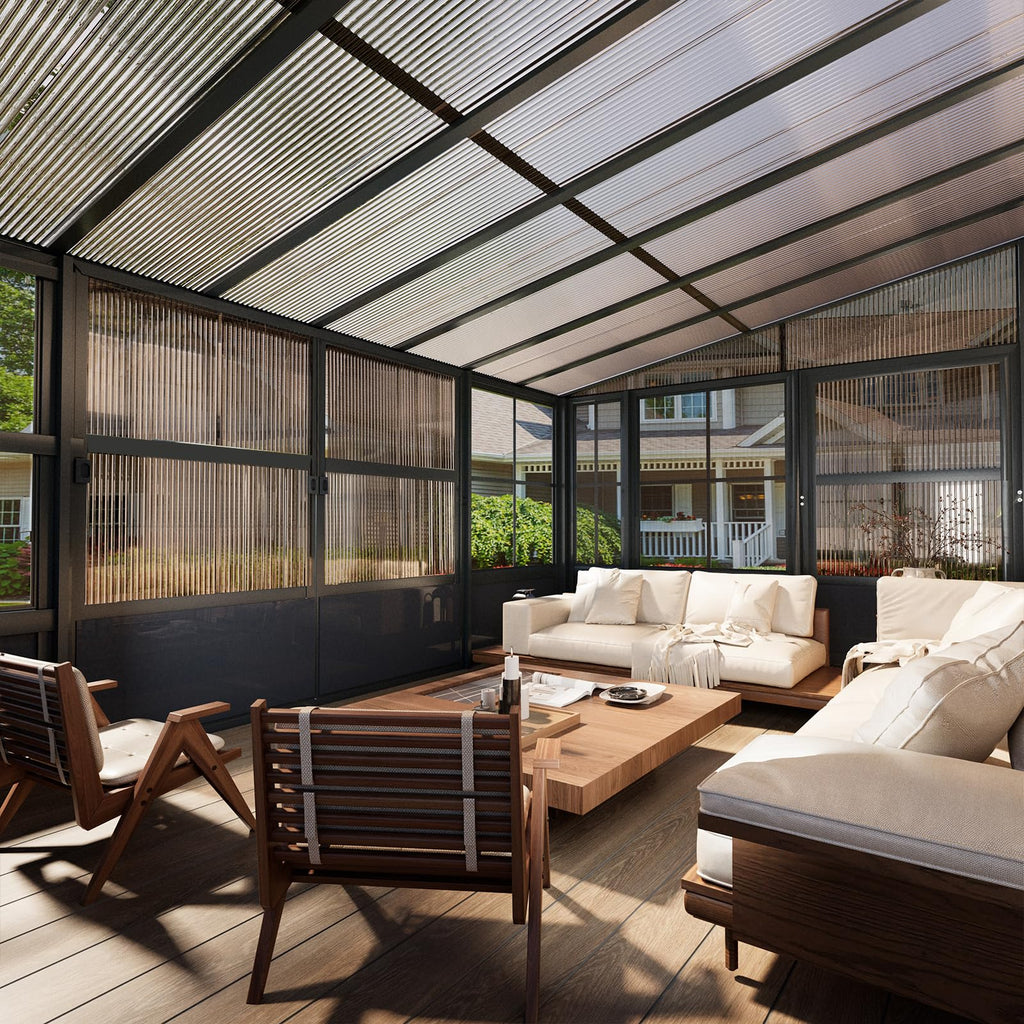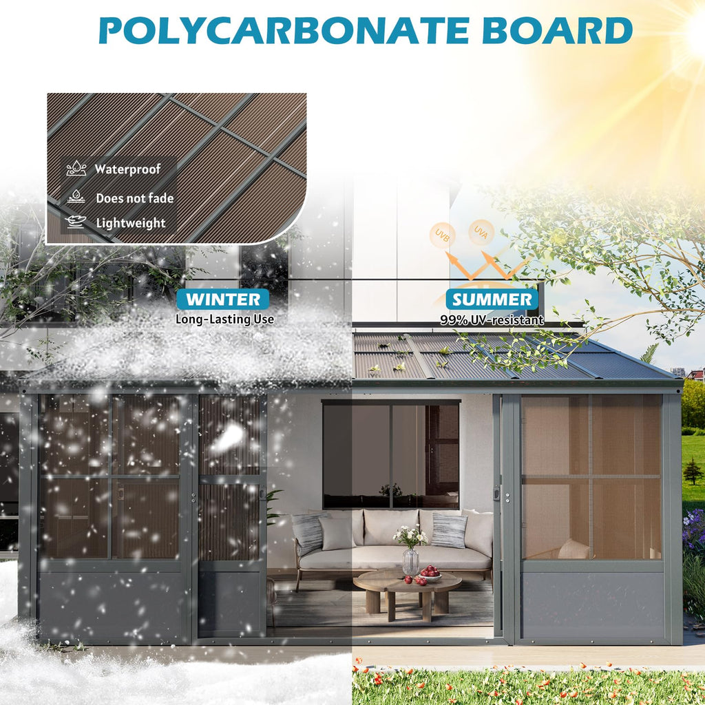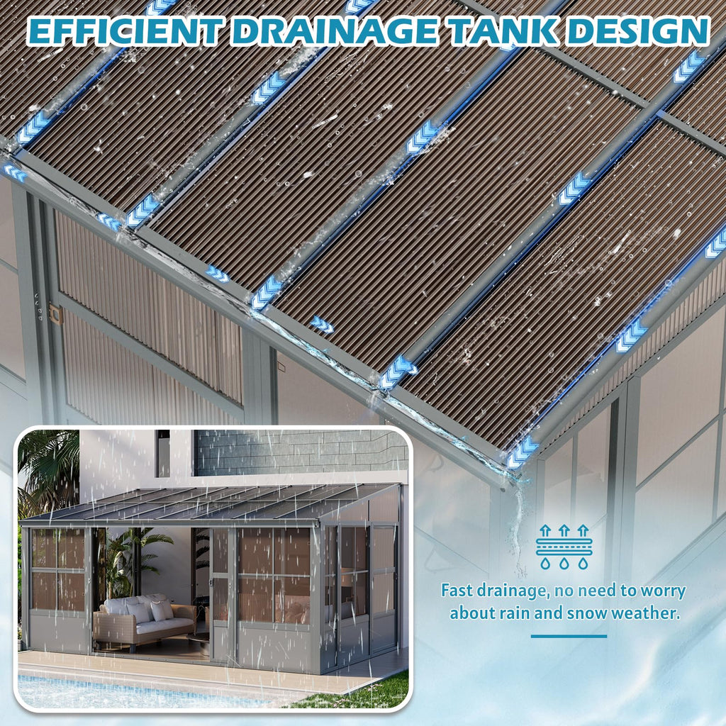 - 【HIGH-QUALITY PC PANEL】: The outdoor sunroom uses PC panels. This material can not only ensure sufficient indoor light, but also block harmful ultraviolet rays and protect privacy. The 6mm thick thickened panels make the sunroom greater stability and weather resistance.