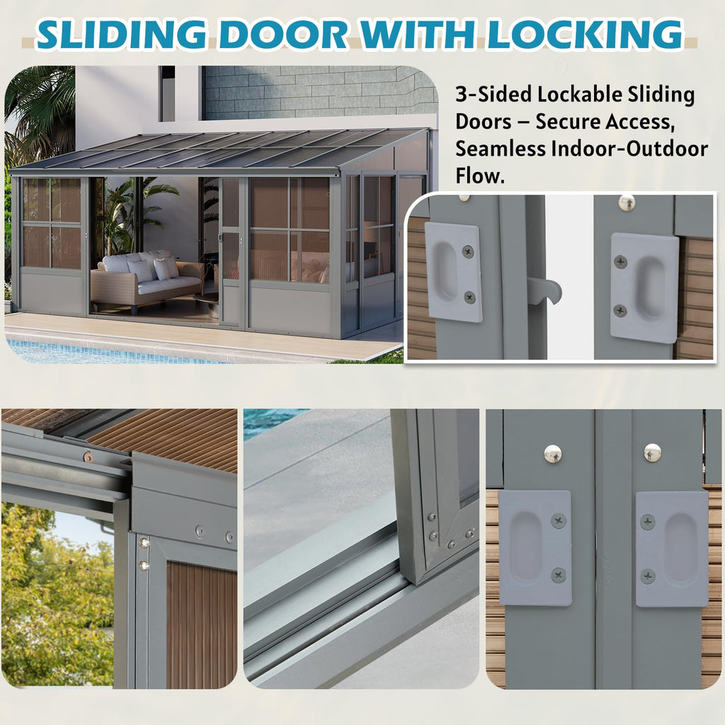 - 【DOUBLE SLIDING DOOR & SECURITY LOCK】: The sun room is equipped with sliding doors on both the front and side, providing you with more options for free entry and exit. At the same time, we are equipped with security locks on each door to provide you with a private space.
