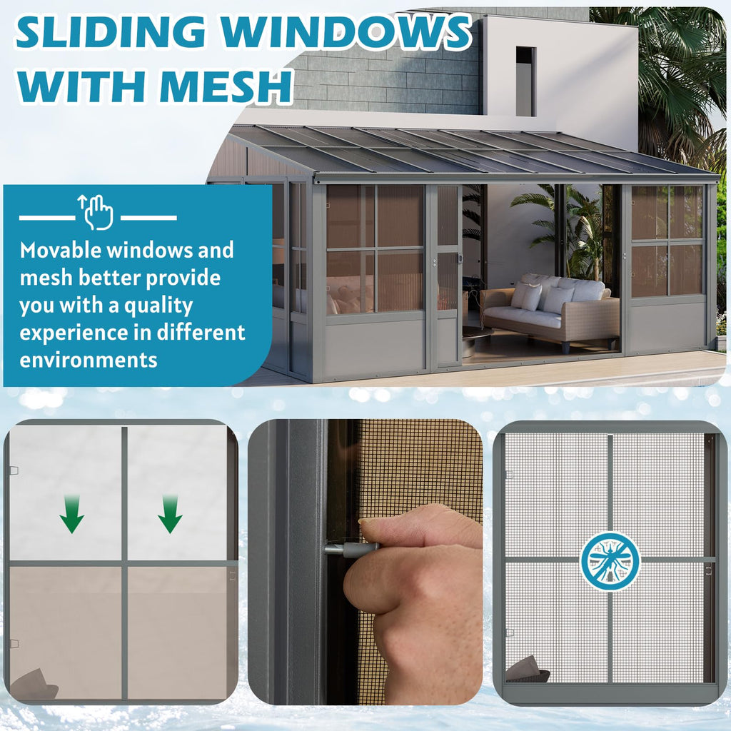 - 【REMOVABLE BREATHABLE MESH WINDOW】The mesh can ensure air circulation in the sun room and prevent mosquitoes, protect privacy and provide excellent views. You can adjust the position of the window and mesh up or down according to your usage needs.