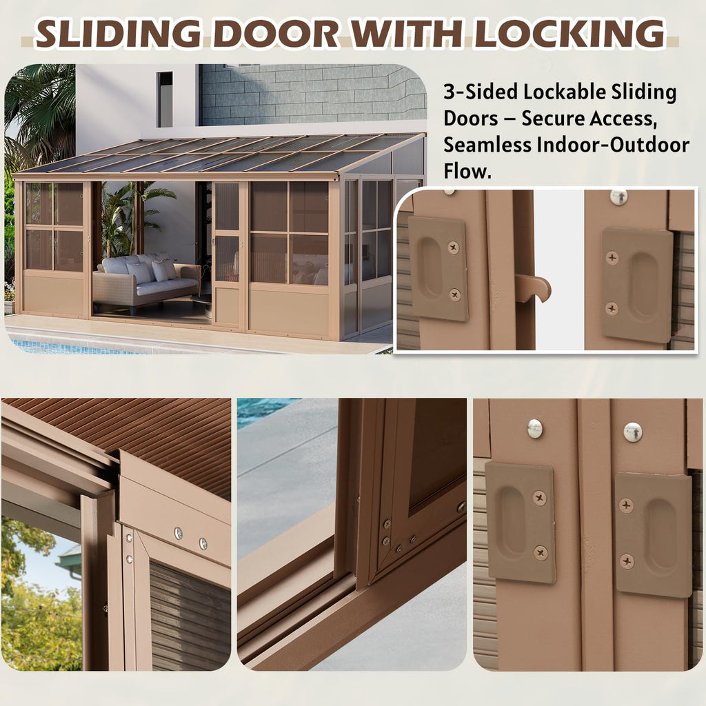 EROMMY 10' x 16' Sunroom, Wall Mounted Gazebo Solarium with Drainage Trough, Polycarbonate Roof, Lean to pergola for Garden, Permanent Sun Room with Lockable Sliding Doors, Brown