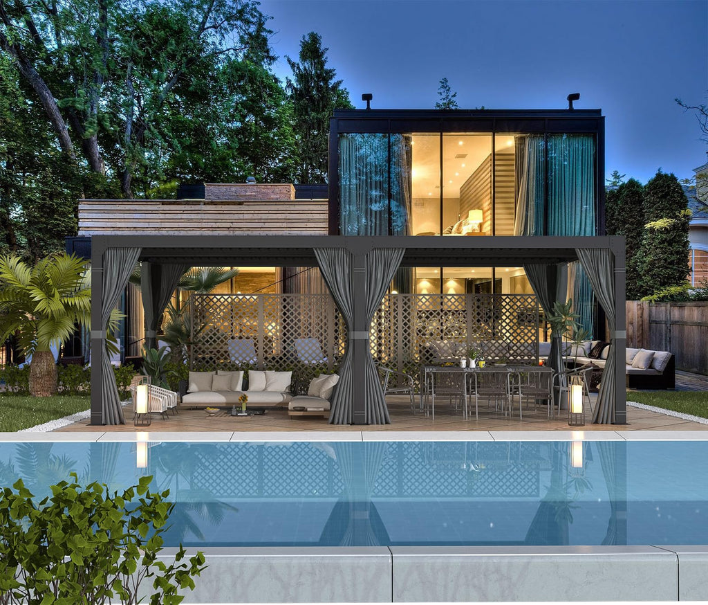 • [ Aesthetics & Protection ] Outdoor pergolas integrate modern design and elegant appearance seamlessly with houses or outdoor spaces. Equipped with removable curtains and mesh screens, one can choose a private area and create a comfortable and versatile living zone, making it an ideal place for gatherings and dining.