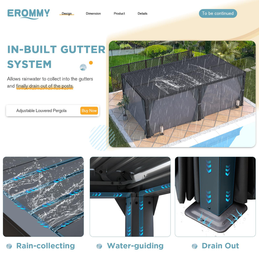 • [ Innovative & Clever ] The outdoor canopy utilizes the horizontal beams as drainage channels, directing rainwater from each panel into a built-in gutter system that is then discharged through the pillars, effectively preventing water accumulation on the roof. The three bands on the poles serve to secure detachable curtains and nets, preventing them from flying during strong winds.