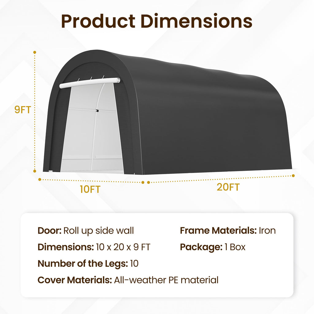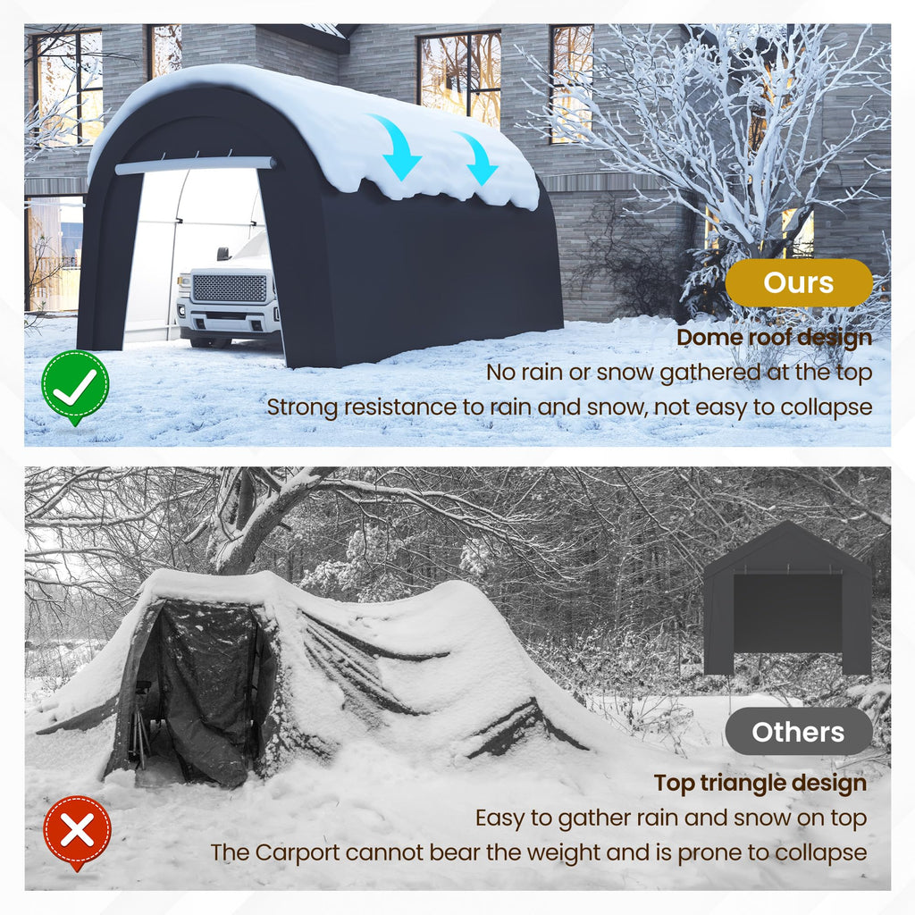 - DOMED CARPORT: 12x25 ft car port dome design prevents water and snow buildup, reducing structural stress and enhancing durability. The sleek, curved shape of the carport is more attractive and provides more interior space and better air circulation