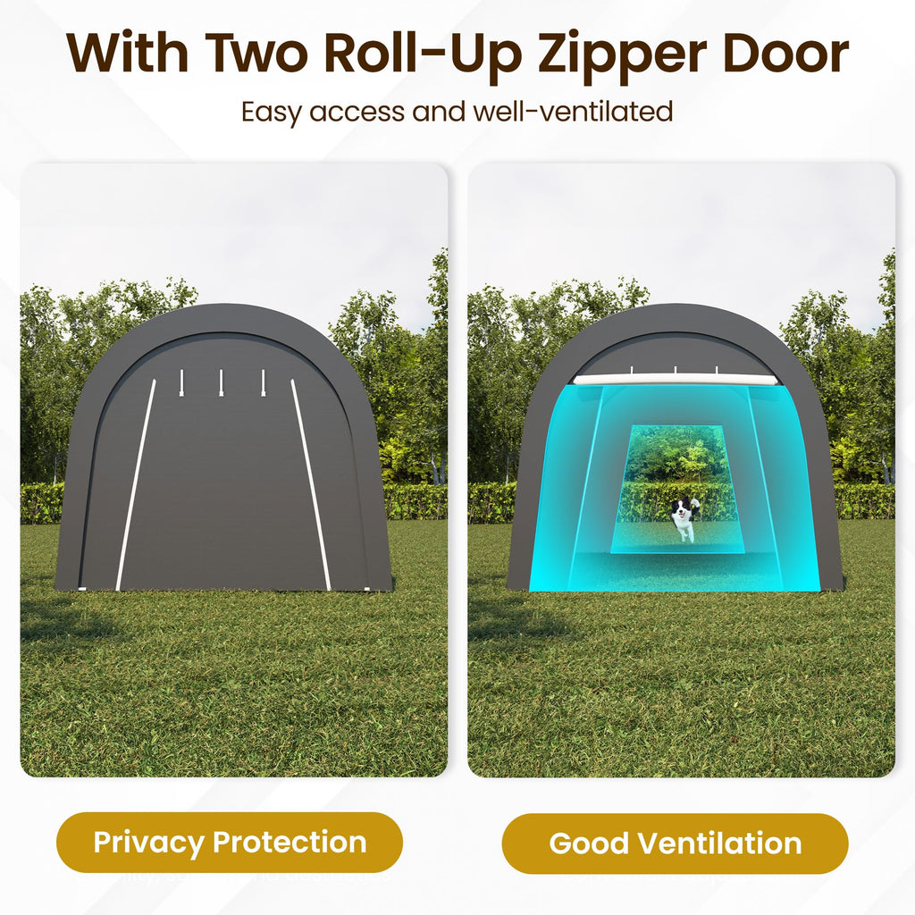 - 2 ROLL-UP DOORS: The outdoor storage shed features two roll-up doors at the front and back, which can be closed or rolled up. Closing the doors to keep a dry environment inside, especially during rain or snow, while also increasing privacy. Rolling up the doors offers easy access, improves airflow, and lets in natural light, brightening the carport
