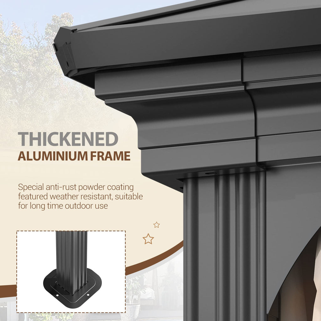 • Rustproof Aluminum:Sturdy hardtop gazebo is made of sturdy aluminum material, which is not only multi-layer thickened inside, but also uses a special protective coating on the surface to provide waterproof and rust-proof characteristics. It is ideal for long time outdoor use