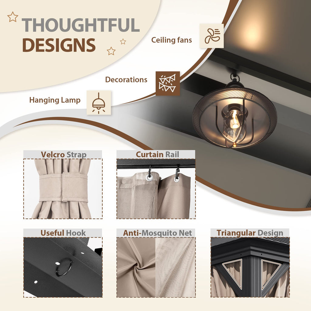 • Curtains, Net and Hooks:The gazebo comes with privacy curtain, with sliding rail you can stretch it to the specified position, while the gauze mesh prevents ash from entering. The top has a small hook, you can hang a night light or a small electric fan