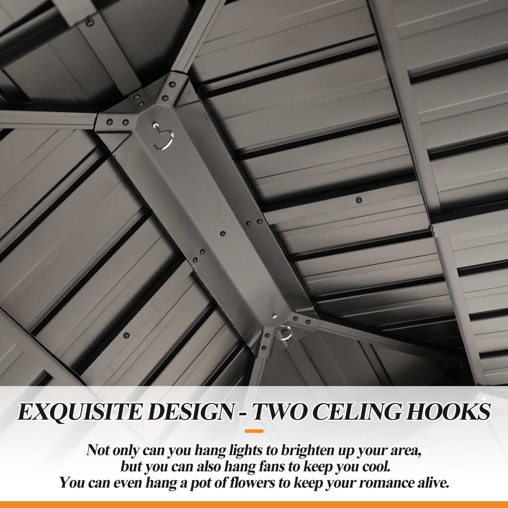 • ⛱️VENTED DOUBLE-TOP DESIGN: Our metal top wooden gazebos feature a double-top design that allows for optimal air circulation to keep you cool and comfortable on hot summer days. On rainy days, double-topped vertical stripes for easy rainwater run-off, and the metal hardtop gazebo effective system also helps to relieve pressure on the galvanized steel gazebo top, ensuring a safe and secure outdoor space.