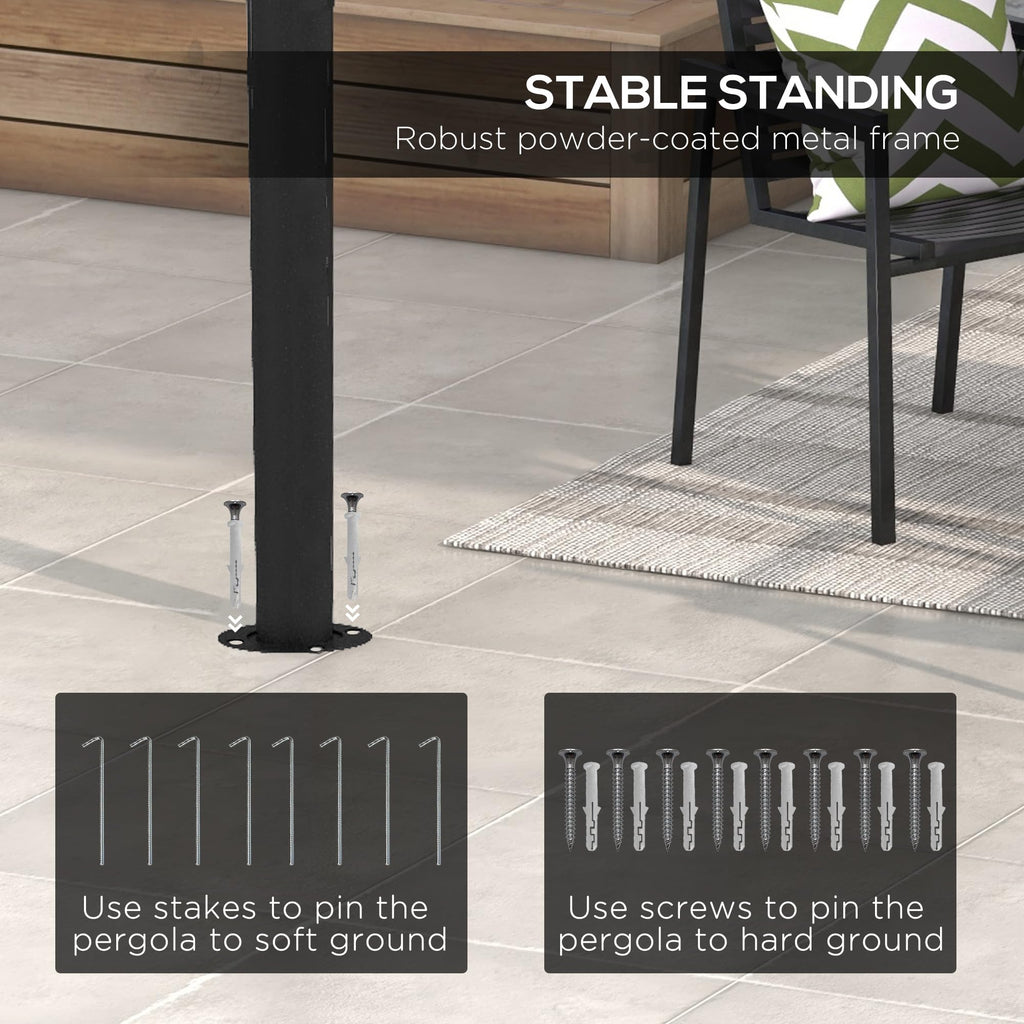 - Solid Metal: Made of strong steel with a powder coating, our pergola canopy's frame is built to endure outdoor conditions like water. Ground nails and expansion screws let you mount your patio pergola to soft or hard ground.