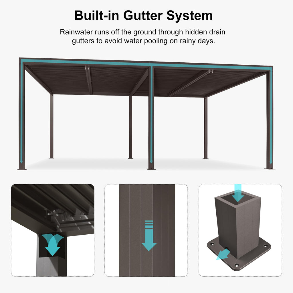 - Hidden Water Gutter Design: The advanced integrated drainage system effectively diverts rainwater from the louvers into the posts in four directions and then to the ground, preventing water accumulation on the roof.
