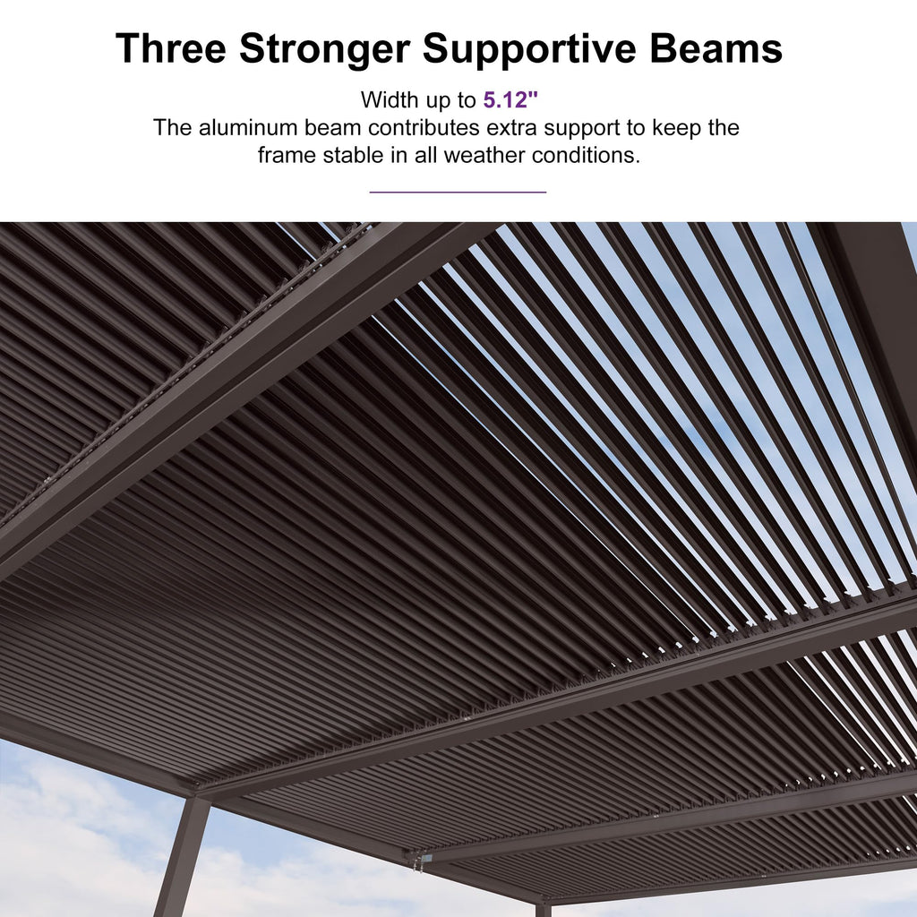 - Reinforced Construction: The durable aluminum framework and three improved larger beams ensure the pergola withstands 60 mph winds.