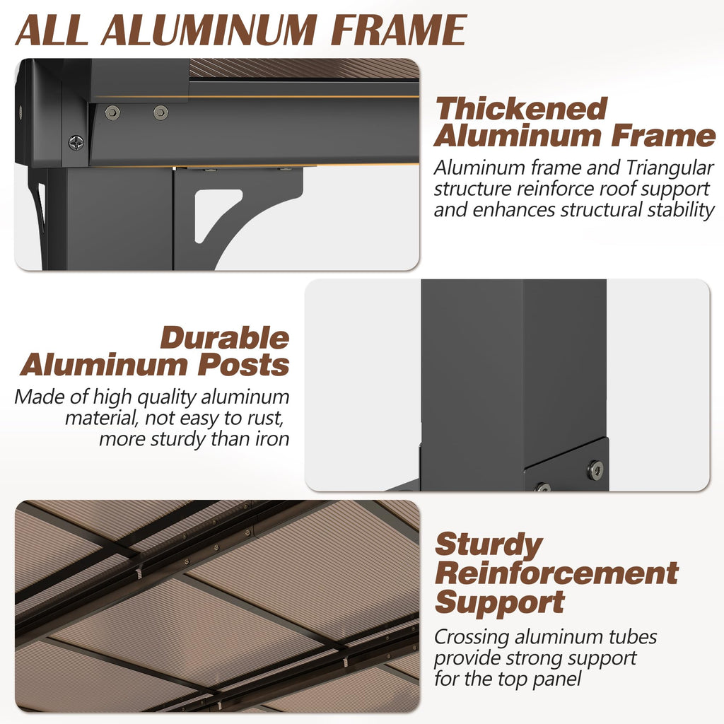 • Sloping Polycarbonate Roof: The slope roof design allows for quick drainage and prevents rainwater from gathering. The hardtop gazebo with polycarbonate roof not only offers ample shade but also help to harmful UV rays.It's the perfect addition to your patio, garden or backyard.