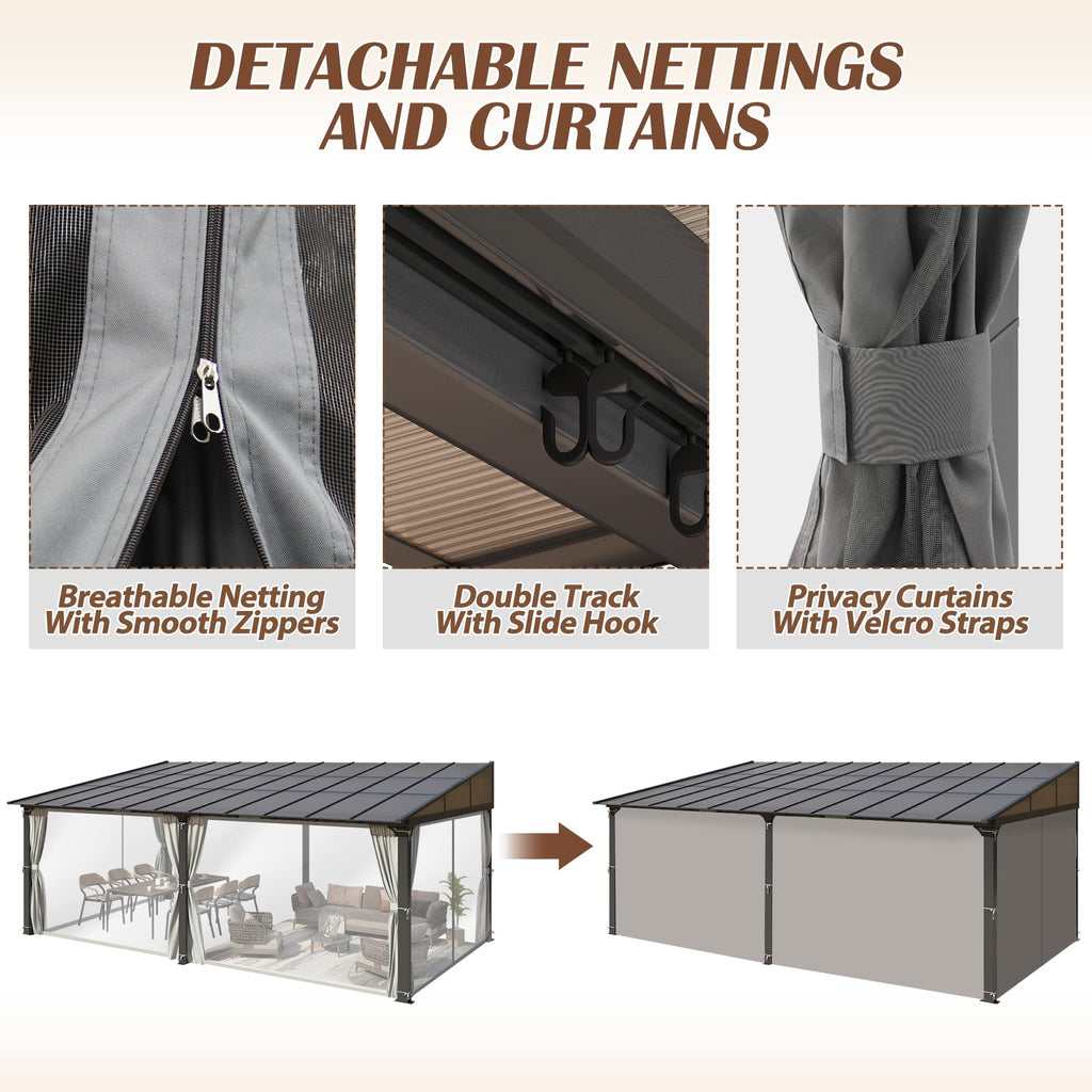 Details: 12 x20FT Outdoor Wall-Mounted Hardtop Gazebo, Aluminum Frame Lean to Gazebo with Polycarbonate Roof and Curtains