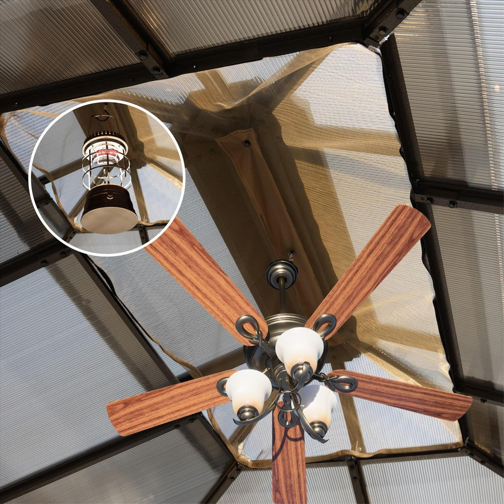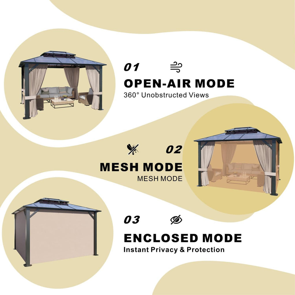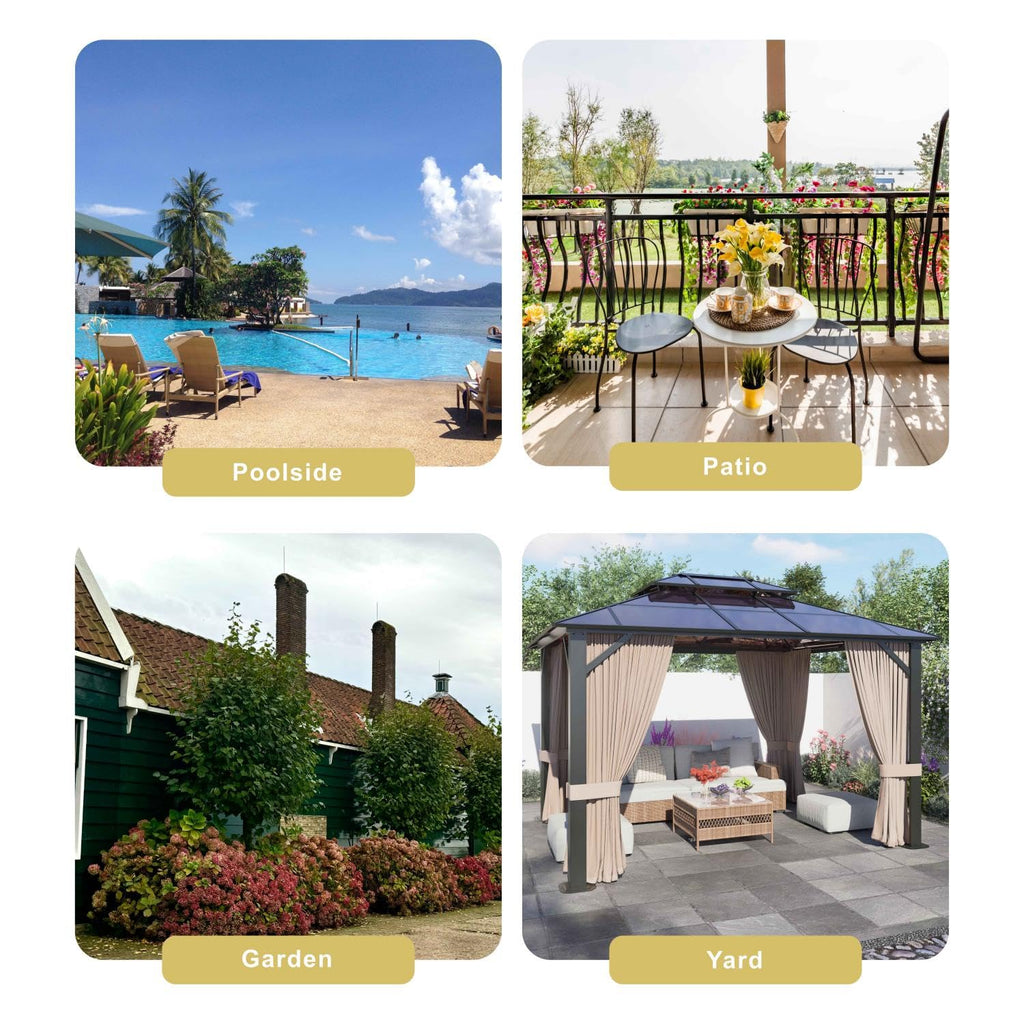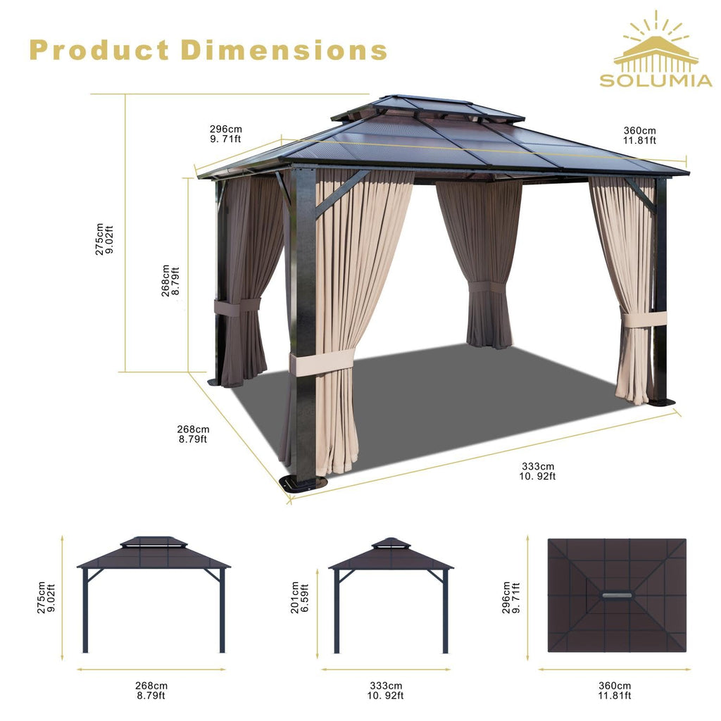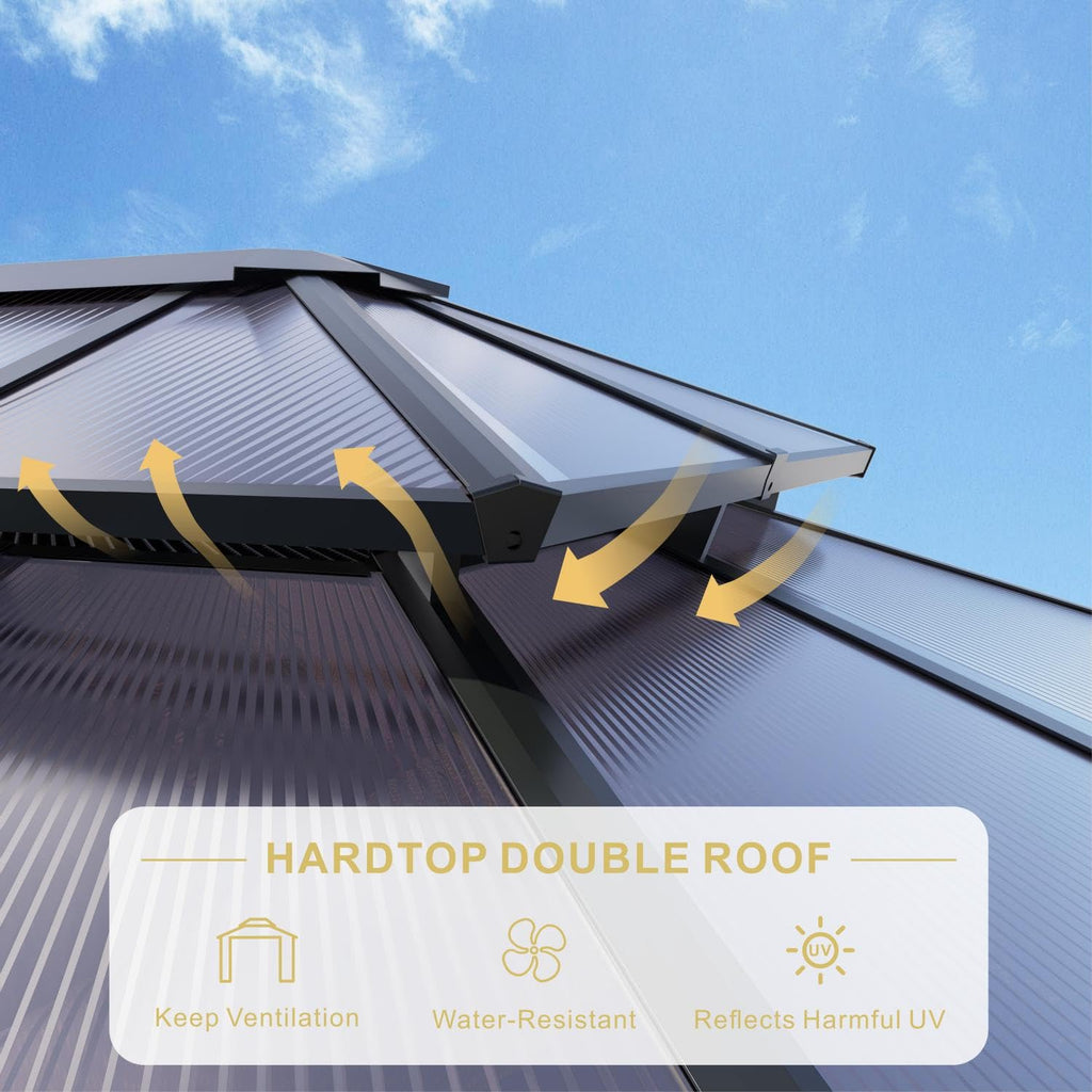 - Double Roof Protection: The SOLUMIA 10’x12’ gazebo features a 6mm UV-resistant polycarbonate double roof with a unique ventilation design. This roof provides full rain and sun protection while maintaining airflow through the hollow core. Perfect for year-round outdoor enjoyment, preventing moisture build-up and condensation during the rainy season.