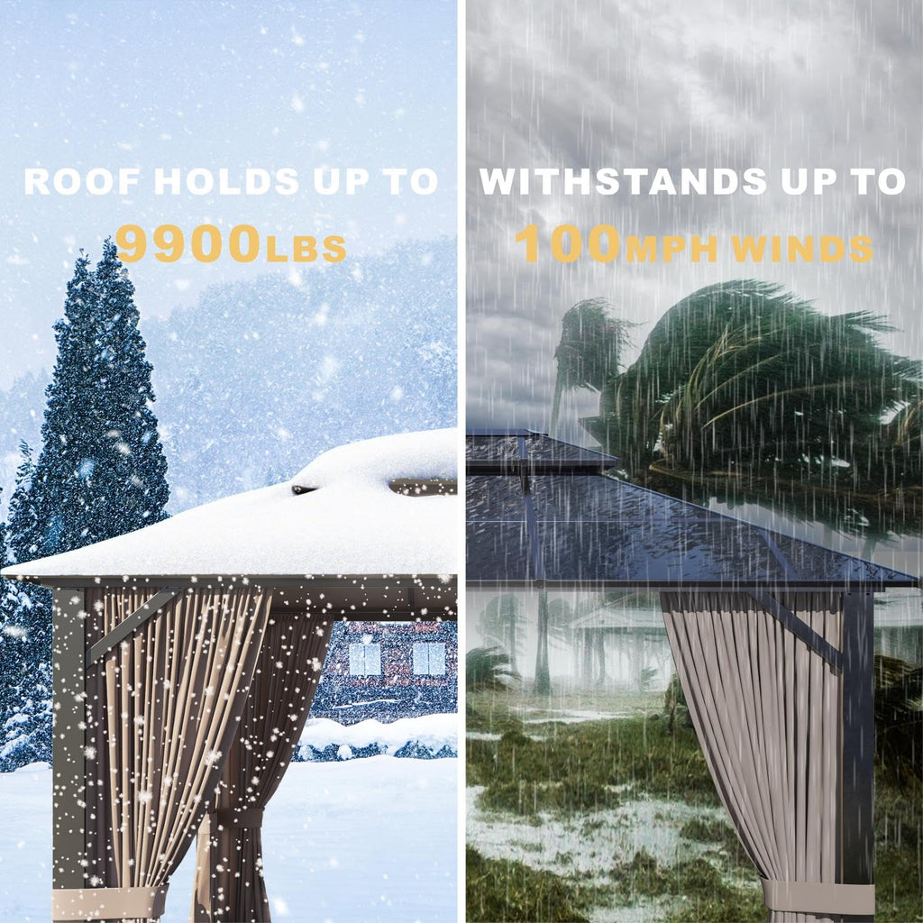 - Durable Aluminum Frame: The gazebo is built with a reinforced aluminum frame, featuring powder-coated surfaces to resist rust and corrosion. With wind resistance up to 35mph, it provides stability and durability, making it perfect for permanent outdoor use, withstanding harsh weather conditions.