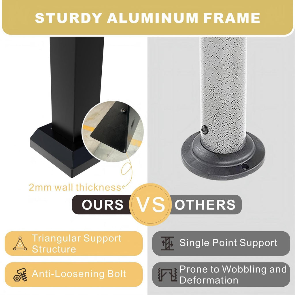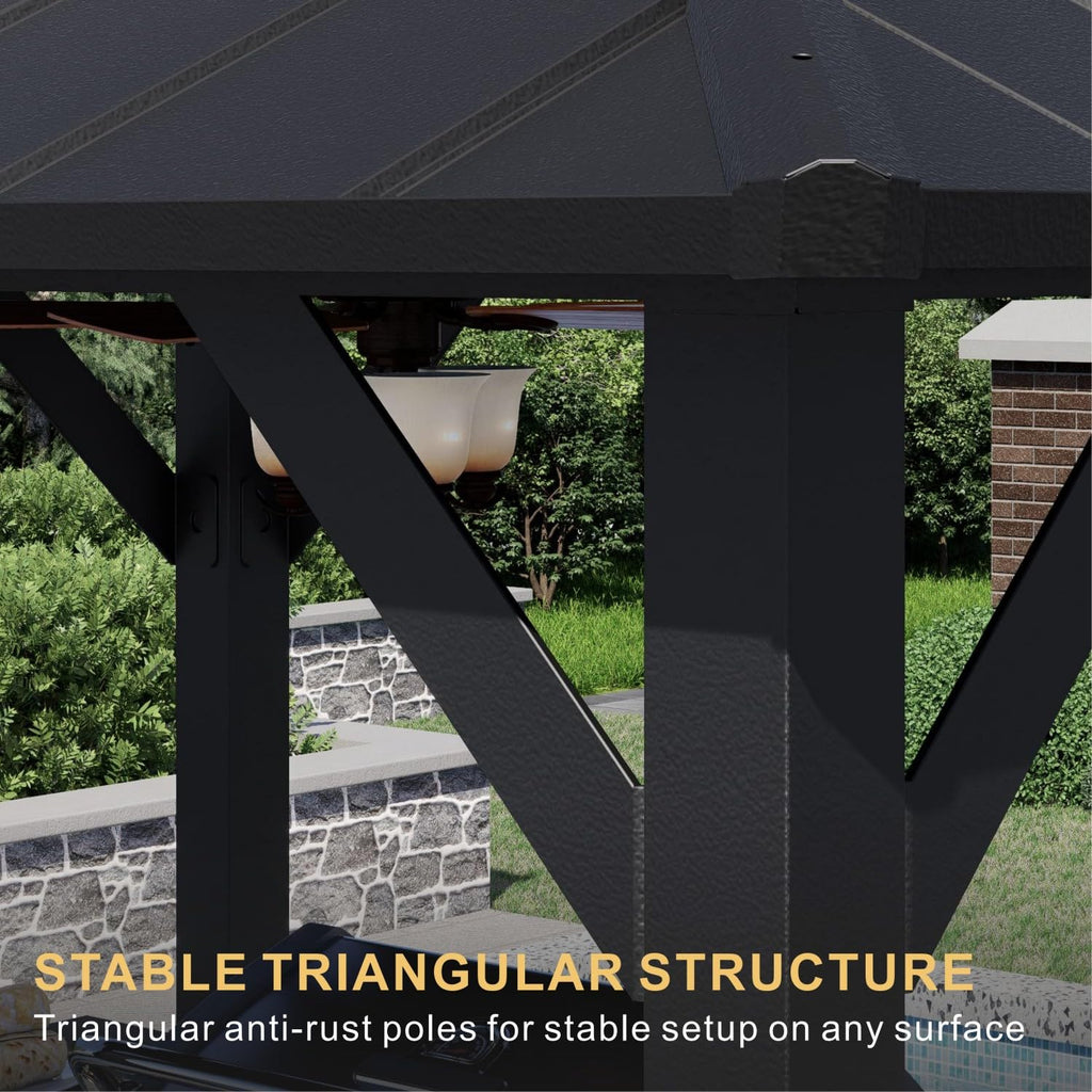 - Durable Aluminum Frame: Built with a robust powder-coated aluminum frame, this gazebo is rust-resistant and fade-resistant. Its reinforced triangular beams and pre-drilled base ensure stability, even in windy conditions.