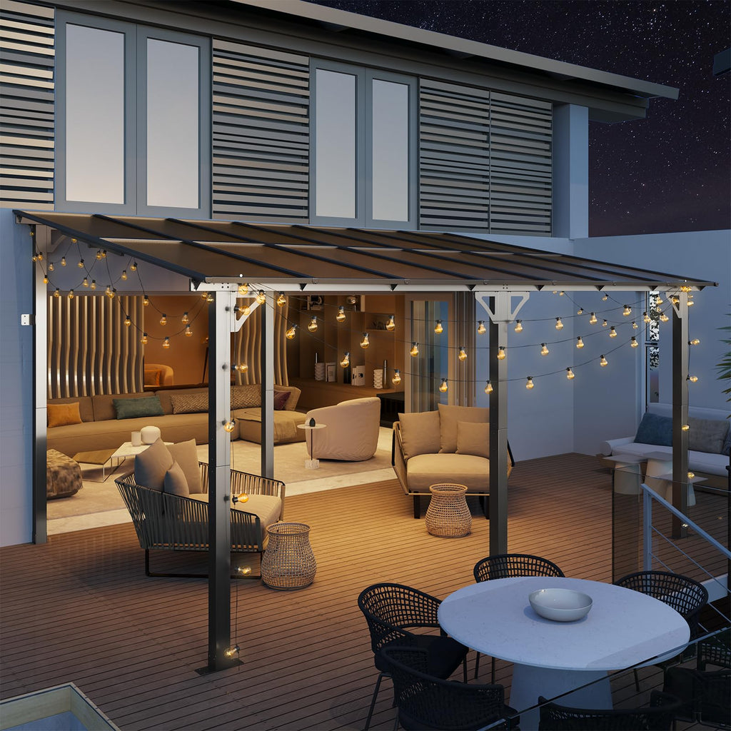 - COMPACT DESIGN: Wall-mounted gazebo is designed to integrate seamlessly with your exterior walls and walkways, saving space. Lean to gazebo can be decorated with string lights to enjoy a warm evening leisure time(our products do not include light strings)