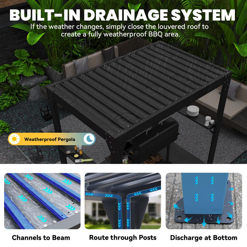 • DRAINAGE SYSTEM: Efficiently channels rainwater through drain gutters inside the beams and posts, preventing water buildup on the louvered pergola's surface. This system directs rainwater away, protecting your BBQ area from wind and rain, ensuring a dry, safe grilling space in any weather
