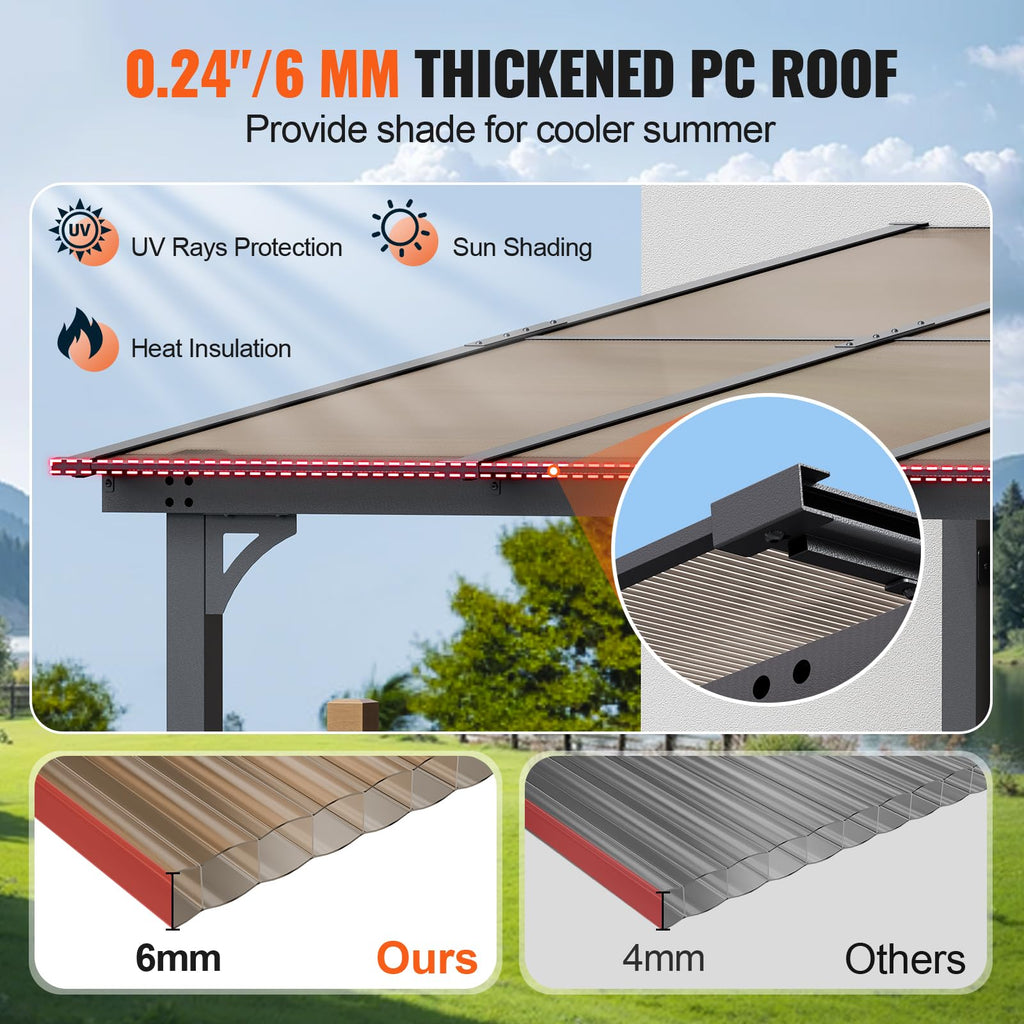 - Stable and Durable: Made with 6mm thickened PC roof and sturdy aluminum columns, the lean to gazebo is easy to clean, and resistant to aging and corrosion, suitable for outdoor environments.