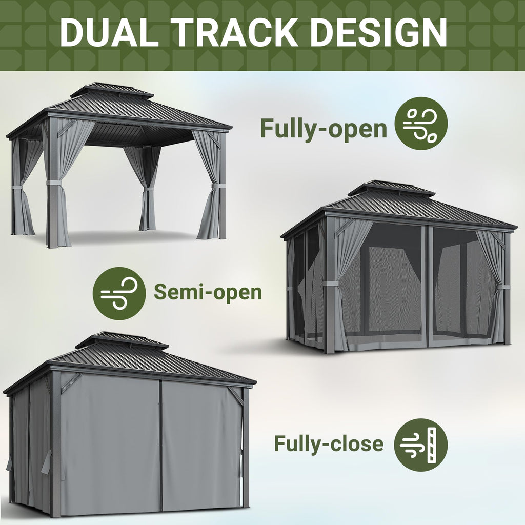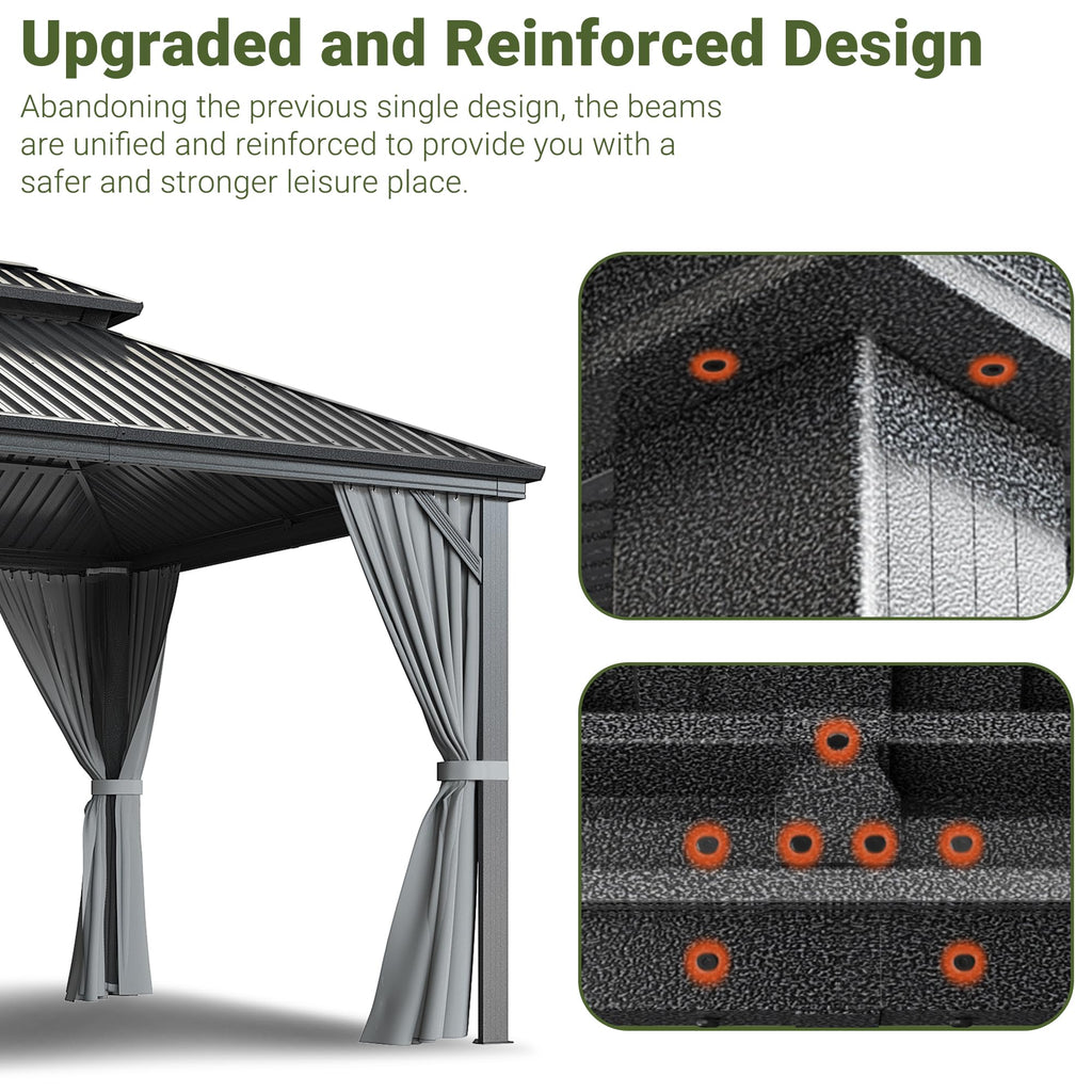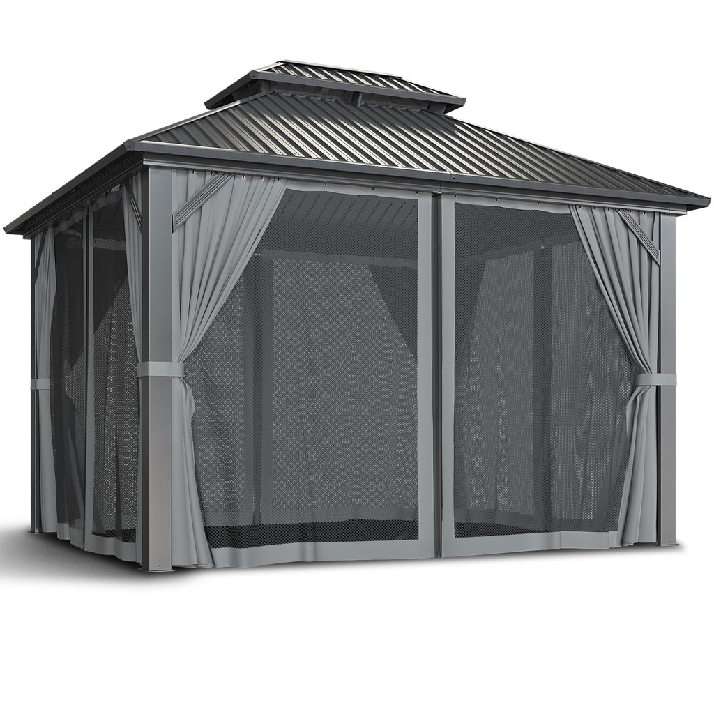 VIWAT 10x12 FT Hardtop Gazebo with Aluminum Frame, Galvanized Steel Double Roof Gazebo with Nettings and Curtains, Permanent Outdoor Metal Pavilion for Patio, Deck, Lawn and Garden, Gray