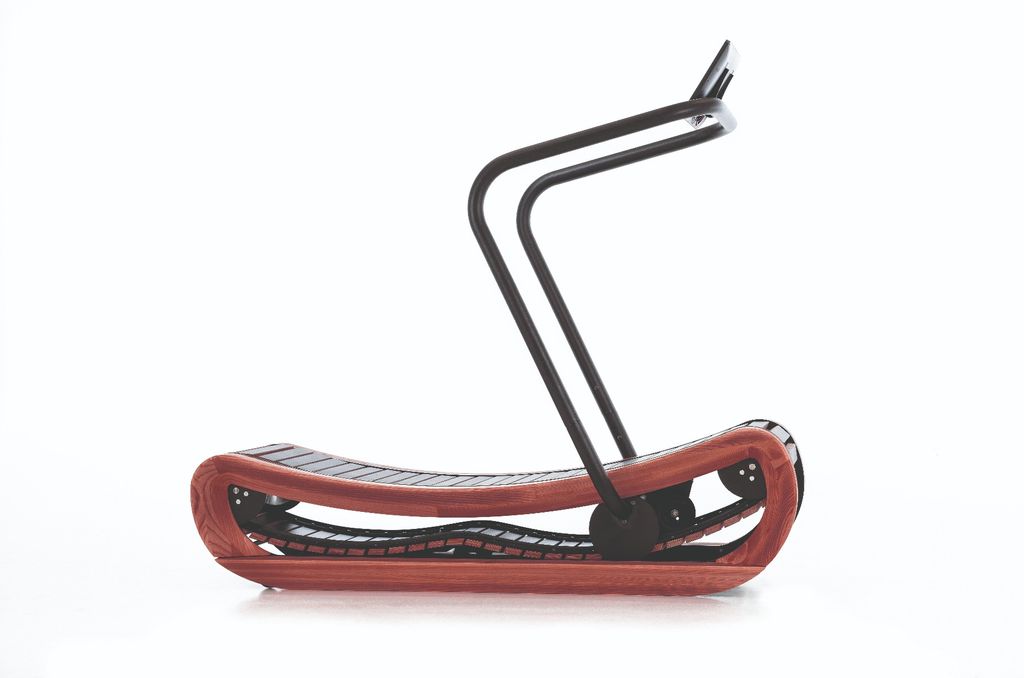 The Sprintbok stands out from the conventional treadmill aesthetic through a slender, curved form and elegant wood frame.