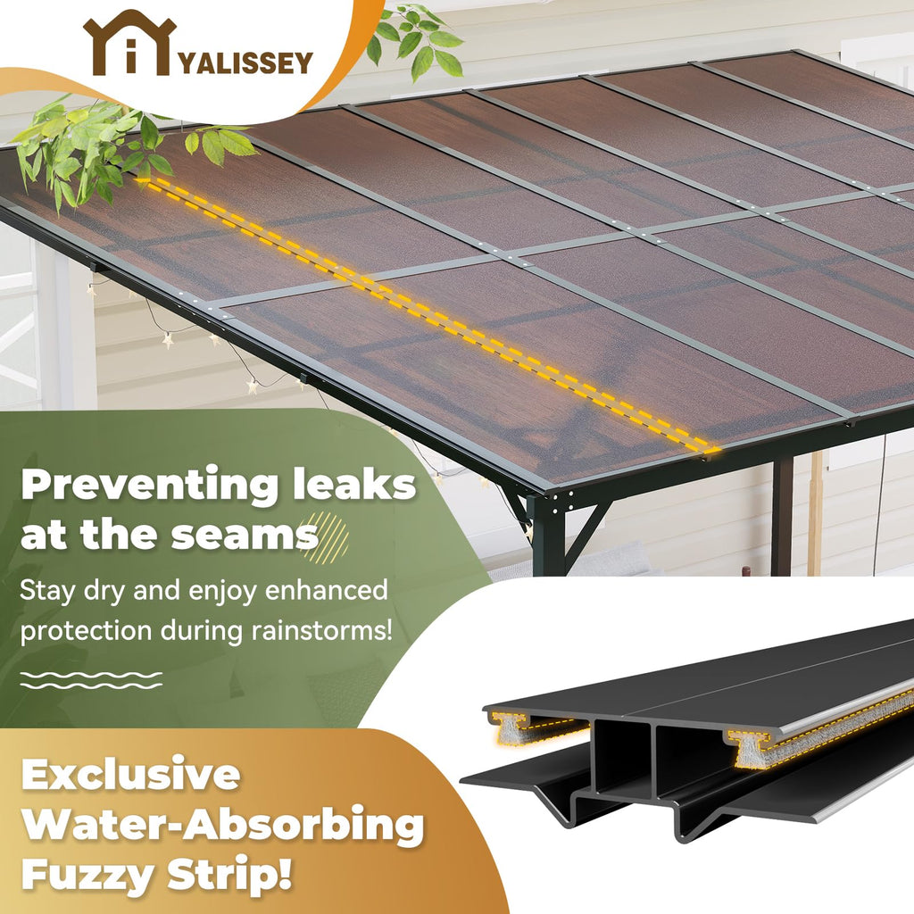 - 【Waterproof Fuzzy Strip】 By reducing water penetration, the waterproof fuzzy strip helps extend the lifespan of the wall mounted gazebo structure.We’ve integrated waterproof fuzzy strip into the interior of the pipes along the vertical seams of the PVC roof panels. The waterproofing design at the seams prevents moisture from accumulating over time, which could cause corrosion or damage, improving the overall durability of the outdoor pergola.