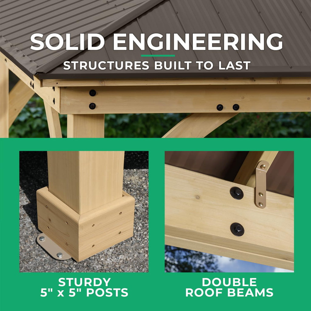 Details: Enhance your outdoor living area with Yardistry's 10’ x 10’ Meridian Gazebo. This wooden gazebo, featuring an aluminum roof, adds charm to any setting, making it ideal for all your outdoor gatherings. Its elegant design showcases a coffee brown colored aluminum roof, sturdy 5.5” x 5.5” posts, and robust curved corner gussets. Crafted from 100% cedar lumber, it boasts a beautiful natural cedar stain finish that adds warmth and character to any space. Follow the illustrated step-by-step instructions for easy installation. The versatile Meridian Gazebo with Aluminum Roof by Yardistry is perfect for transforming any outdoor area into a functional and inviting space.