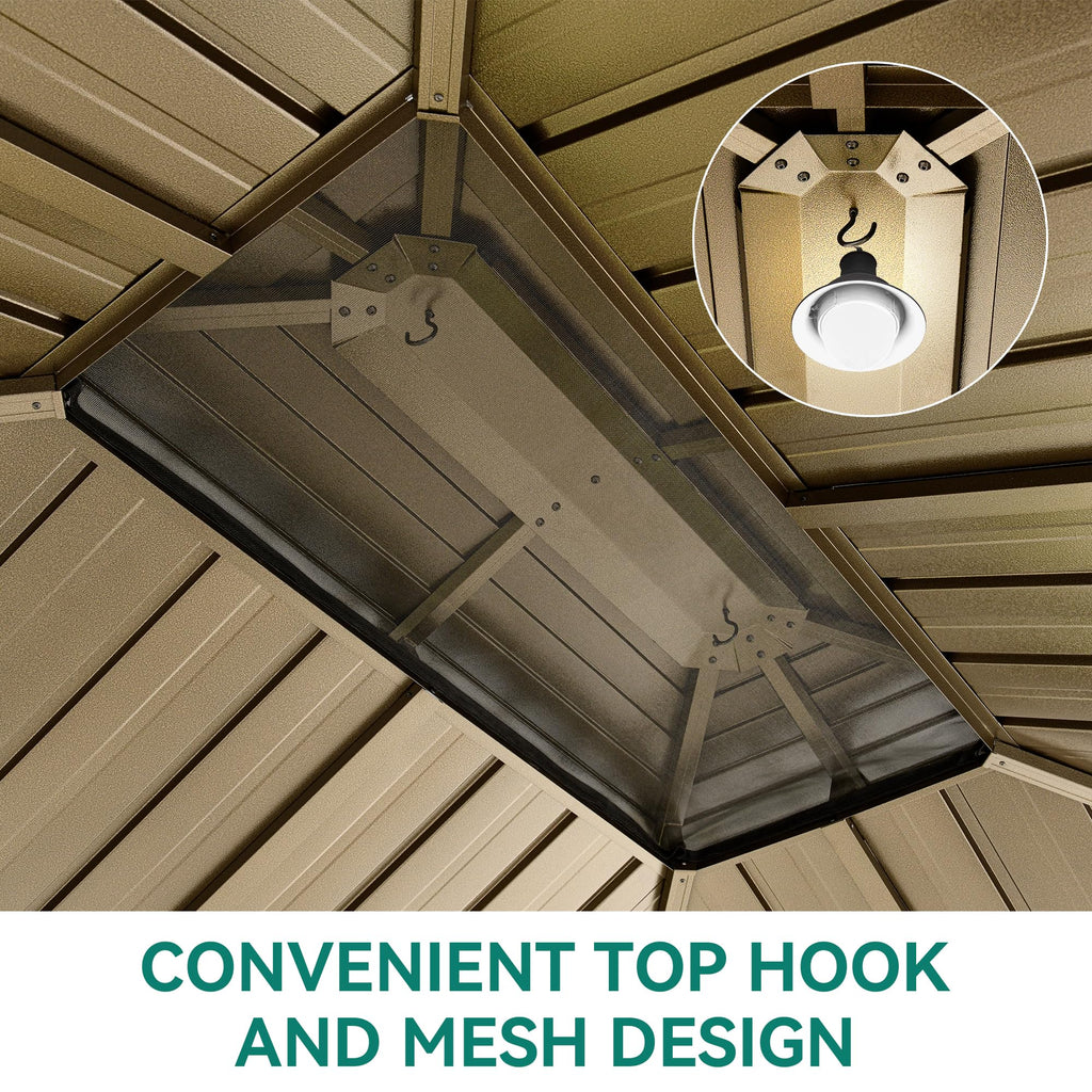 - DOUBLE COMBINED ROOF- The gazebo roof combined by small horizontal stripes top and large vertical stripes top; Features a galvanized iron sheet top that prevents fading and prolongs lifespan, double top vented for optimum airflow and comfort during periods of strong wind. The middle of roof has 1 hook that can be hung with lights or fans to convenient your life