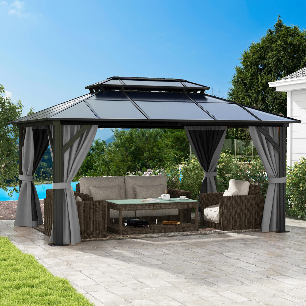Details: 10x13 ft HardTop Gazebo with Nettings and Curtains Outdoor Heavy Duty Double Roof Gazebo permanent aluminum frame structure outdoor heavy duty netting privacy polyester fabric curtains backyard garden lawns deck events parties sun shade shelter patios