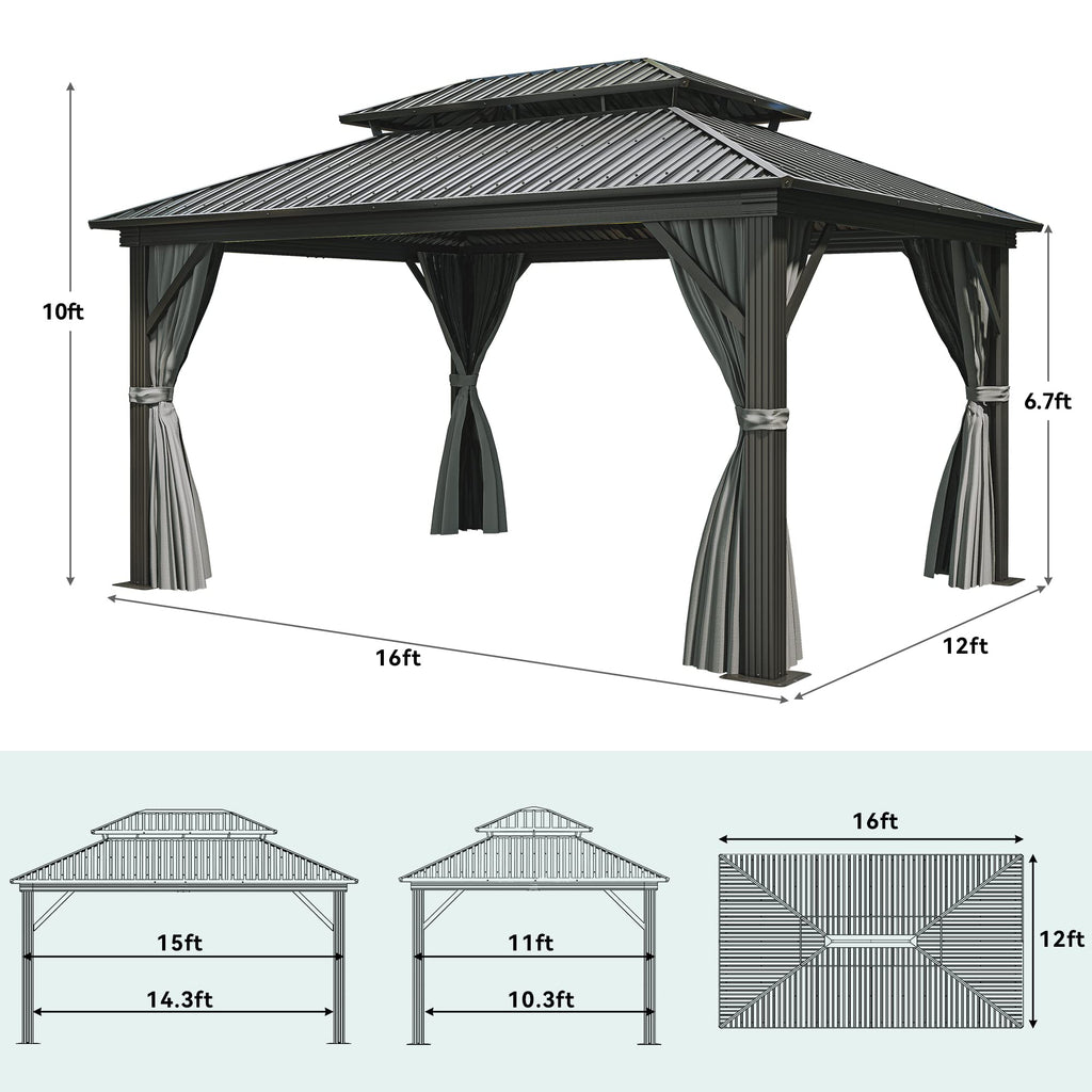 - DOUBLE LAYERED SIDEWALL- Hard top gazebo features fully enclosed double-sided zipper, double trail system and double layer sidewall. Gray polyester cloth and black mesh grant good ventilation and an open view; protect you from rain and UV rays while adding more privacy. Provide a safe and comfortable environment for your family and children