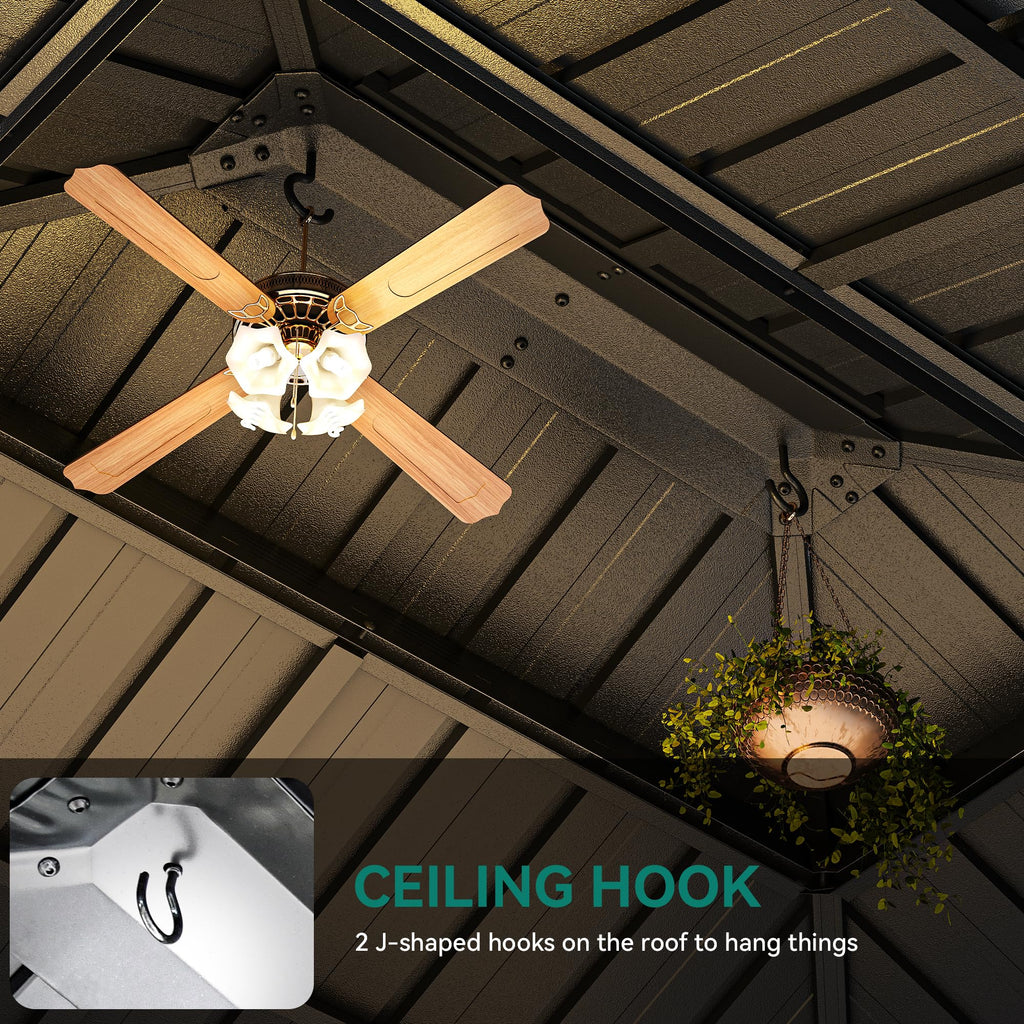 - Dual-Galvanized Iron Roof: Fade-resistant, durable galvanized iron top with double top vents for optimal airflow in high winds. Two central hooks accommodate lights/fans to elevate outdoor comfort. Combines weatherproof longevity with versatile design for extended enjoyment