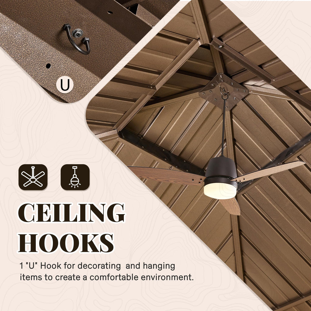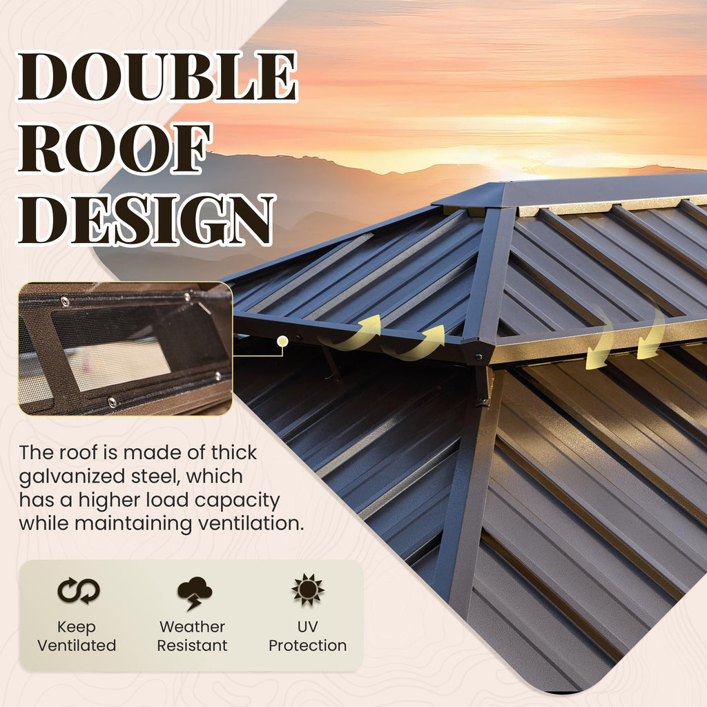 - GALVANIZED STEEL DOUBLE ROOF: This patio gazebo has a double-layer galvanized steel roof that offers great ventilation and airflow. Its sturdy construction provides protection against wind, rain, and snow, while the galvanized steel material ensures thermal insulation, waterproofing, and noise reduction.