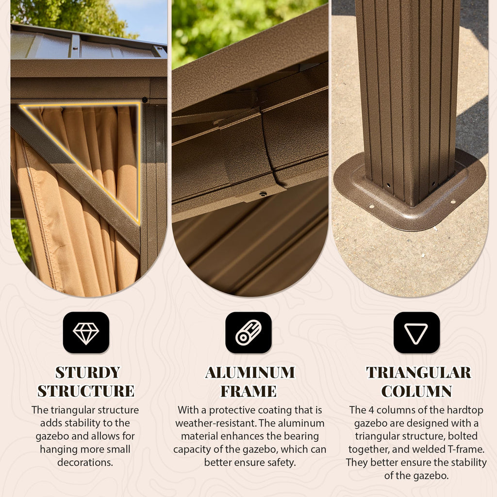 - ALUMINUM FRAME: Sturdy permanent hardtop gazebo built with triangular powder-coated aluminum frames, which are more stable and durable than the standard. The 12x12 gazebo with pre-drilled bases is designed for various kinds of ground and can be installed in different outdoor situations.