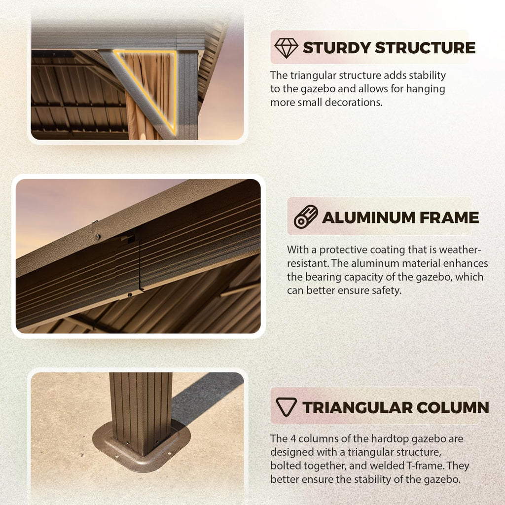 - 【Aluminum Frame】 - Sturdy permanent hardtop gazebo built with 3.94" x 3.94" triangular powder-coated aluminum frames, which are more stable and durable than the standard. The 12x14 gazebo with pre-drilled bases is designed for various kinds of ground and can be installed in different outdoor situations.