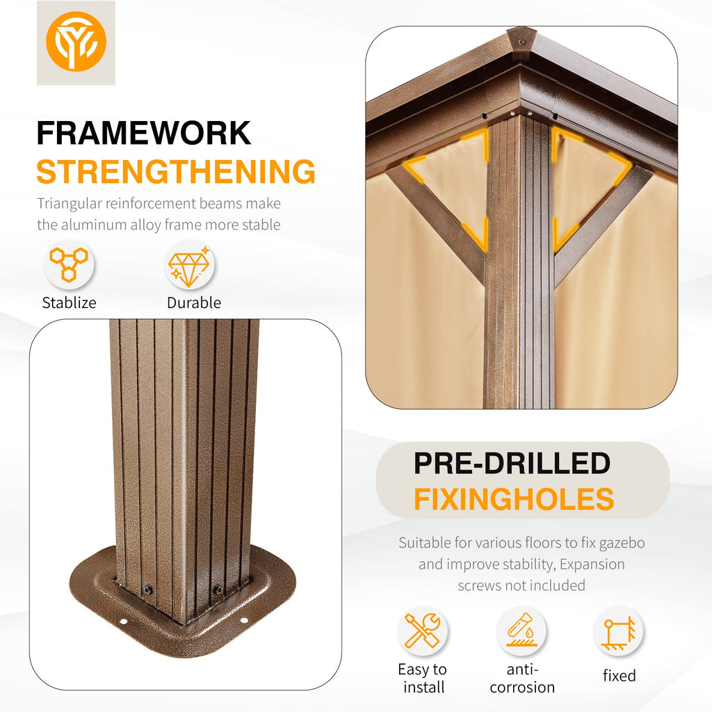 - RUSTPROOF ALUMINUM FRAME: Sturdy permanent hardtop gazebo built with 4.8" x 4.8" triangular powder-coated aluminum frames, which are more stable and durable than the standard. The pavilion gazebo with pre-drilled bases is designed for various kinds of ground and can be installed in different outdoor situations.