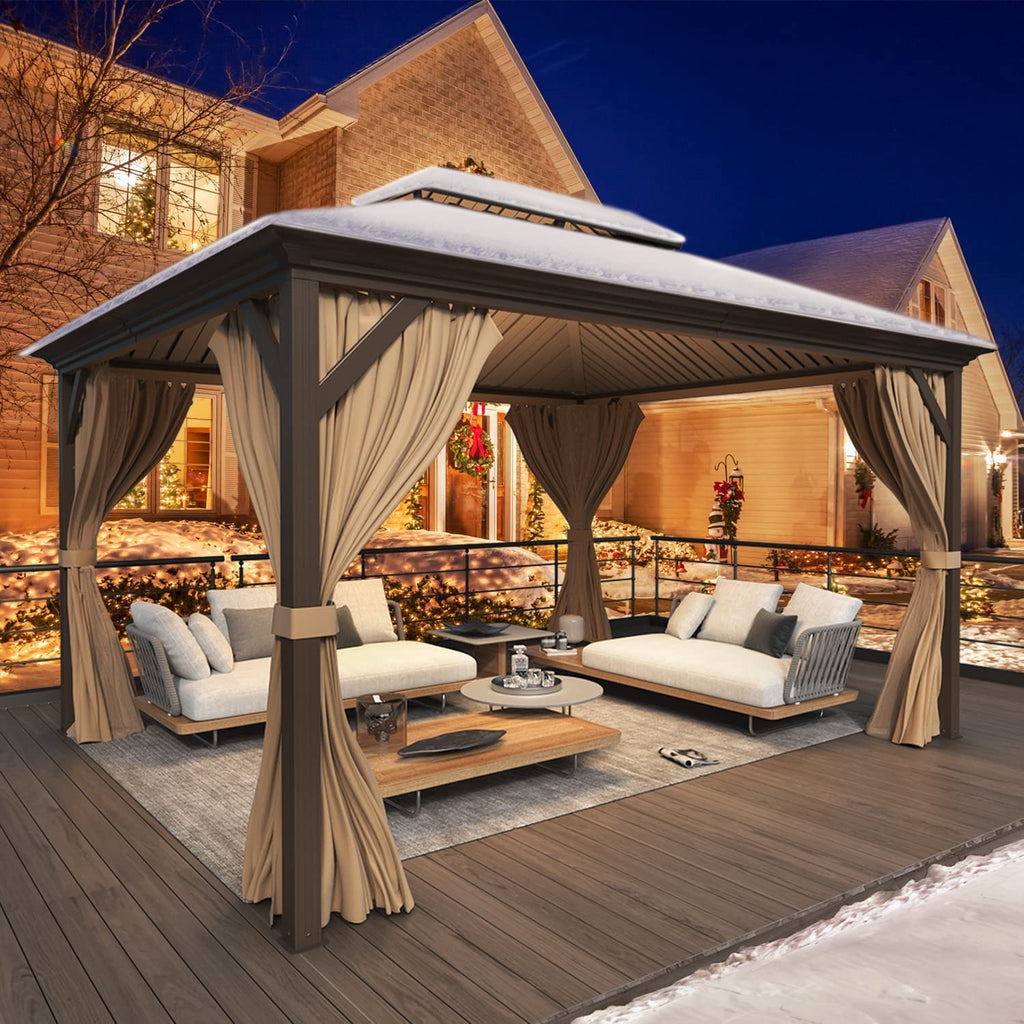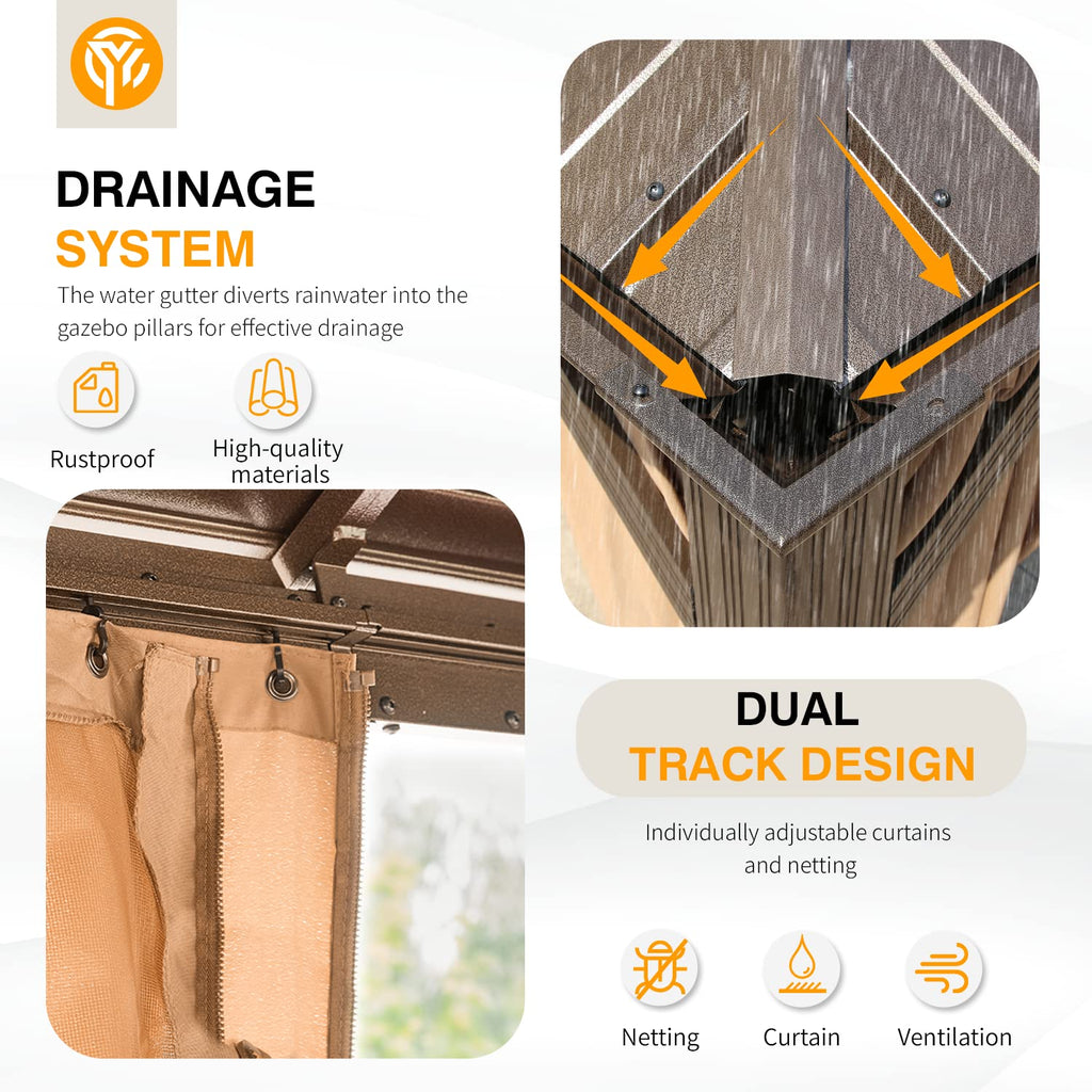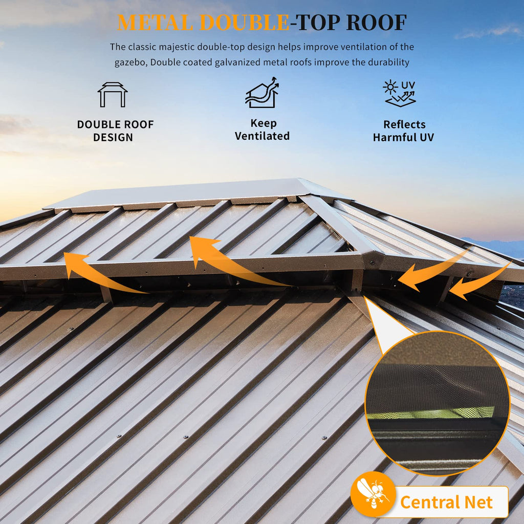- GALVANIZED STEEL DOUBLE ROOF: Instead of fabric/ polycarbonate, the fade-resistant & rust-resistant galvanized steel roof keeps out strong light and harmful UV rays, the metal gazebo is also strong enough to withhold heavy snow and wind. The water gutter design ensures rainwater flows from the edge into the leakage hole to the ground, reducing troubles during rainy. The double top design makes a majestic appearance and also keeps ventilation, cooling, and slowing down the wind speed.